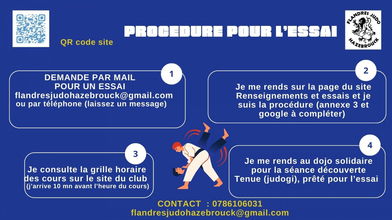 - Etape 1 : Au préalable , envoyez un mail pour nous informer de votre souhait de réaliser une séance d'essai : flandresjudohazebrouck@gmail.com ou Je complète le google essai si j'ai déjà été renseigné